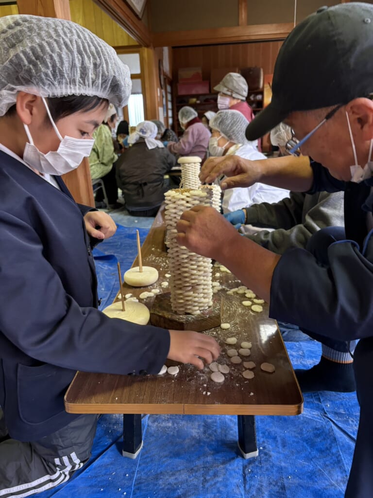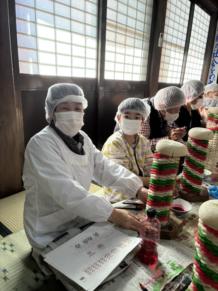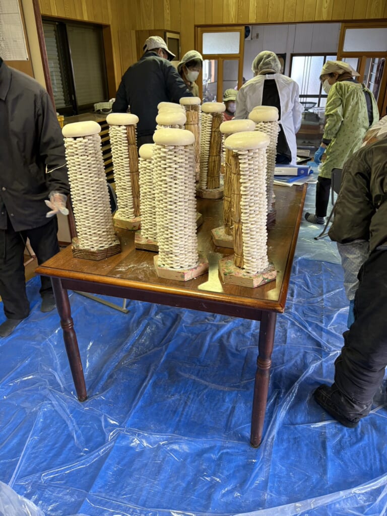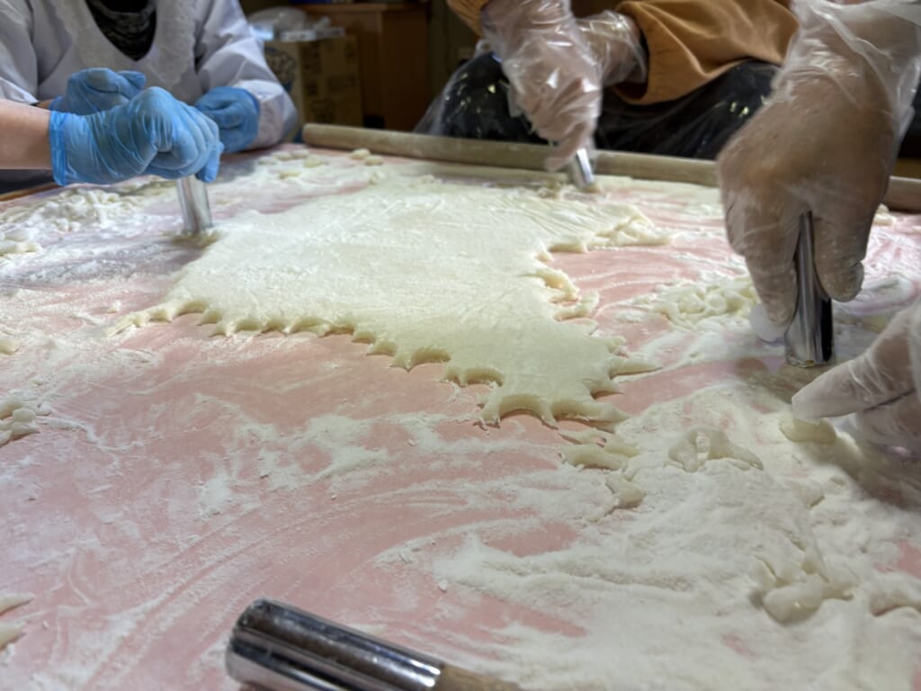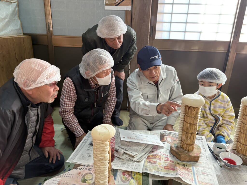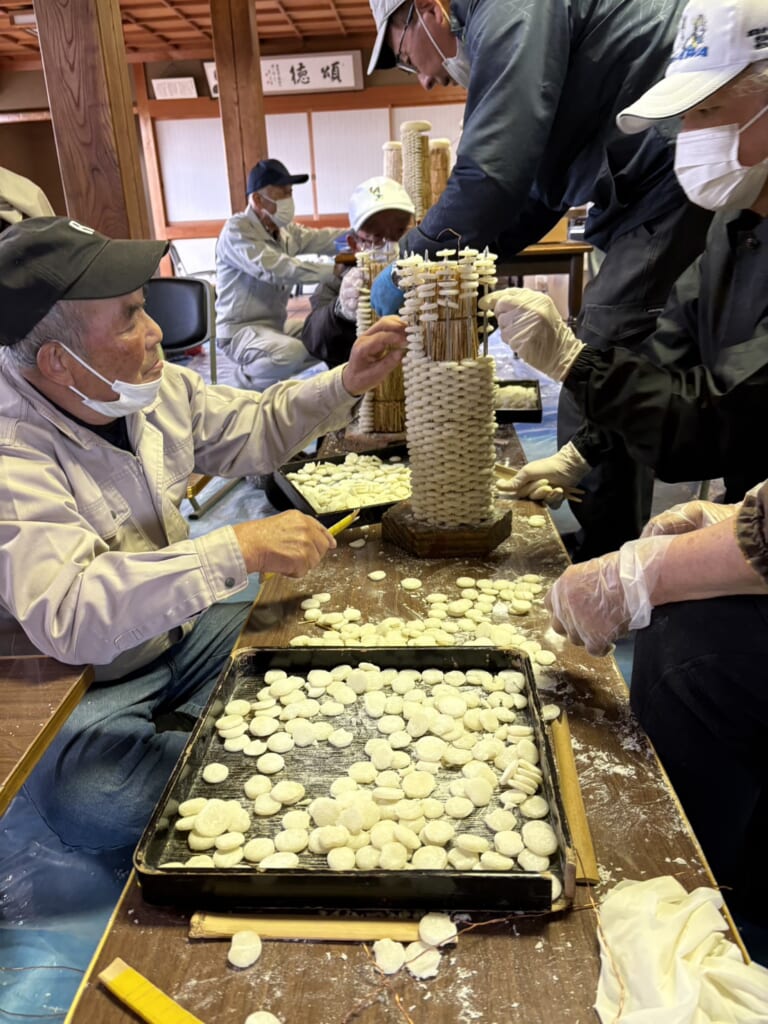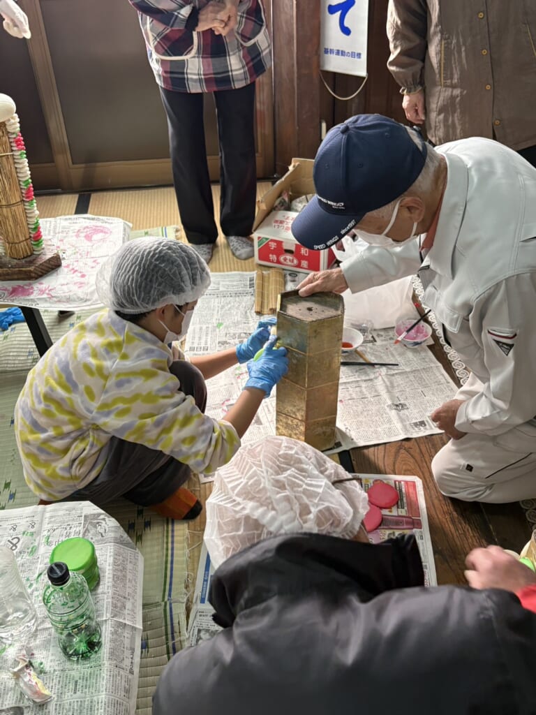 10日のお餅つき、型抜き、木の板に広げて同じ厚さにする作業
