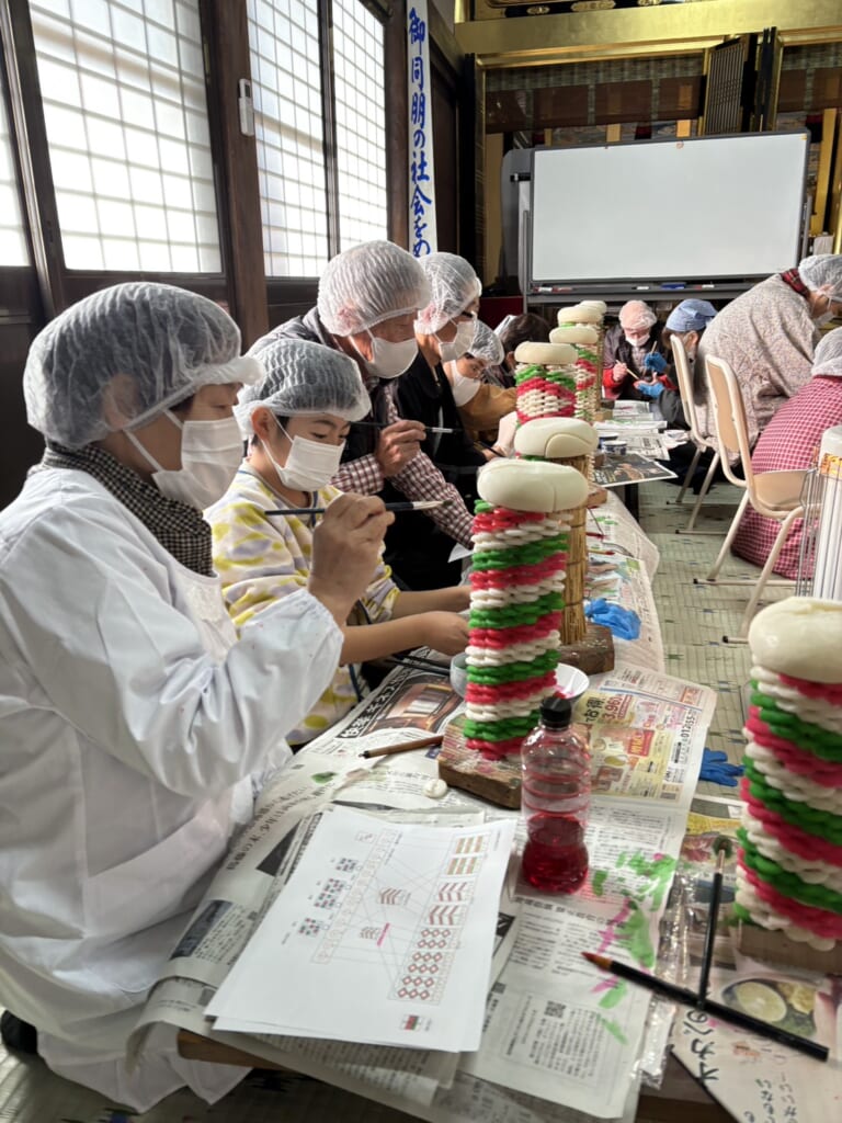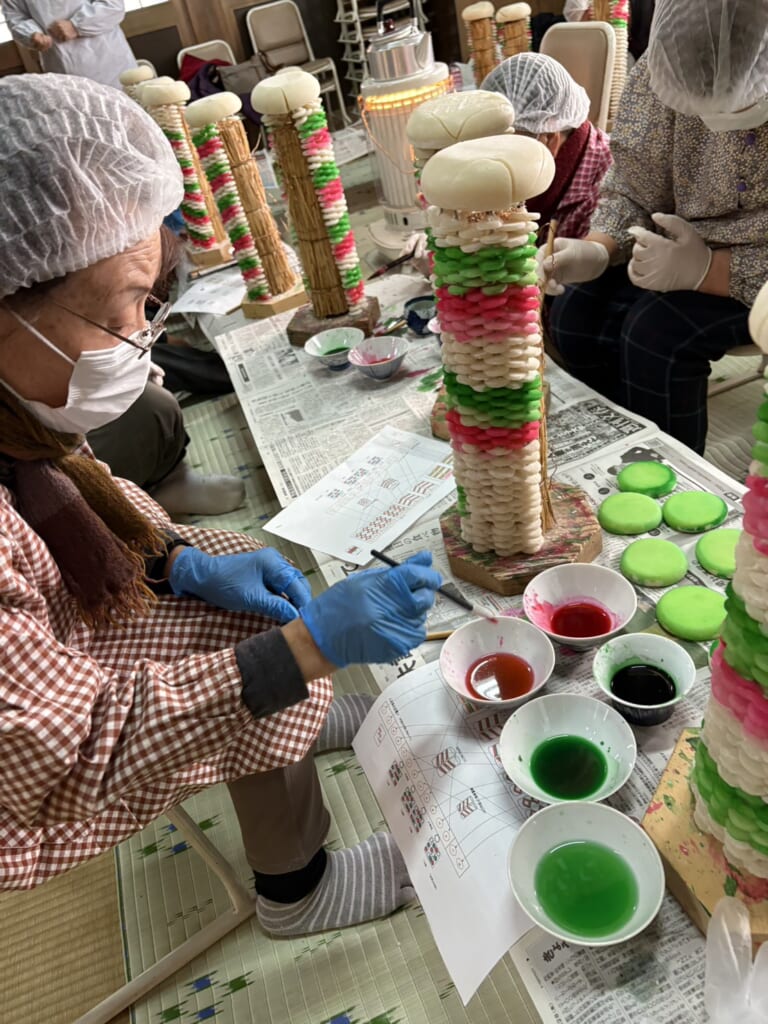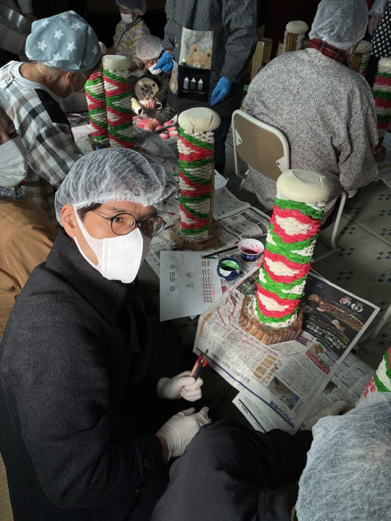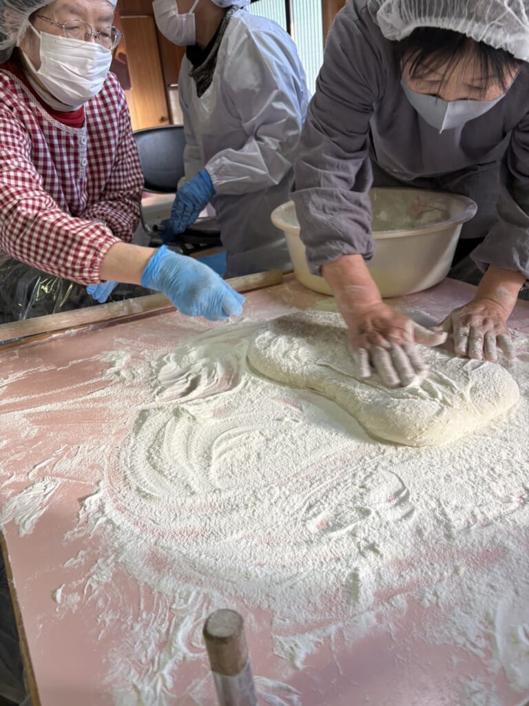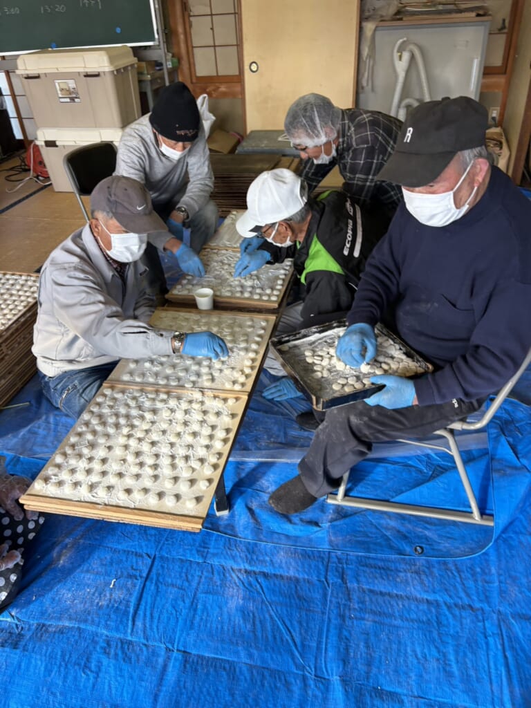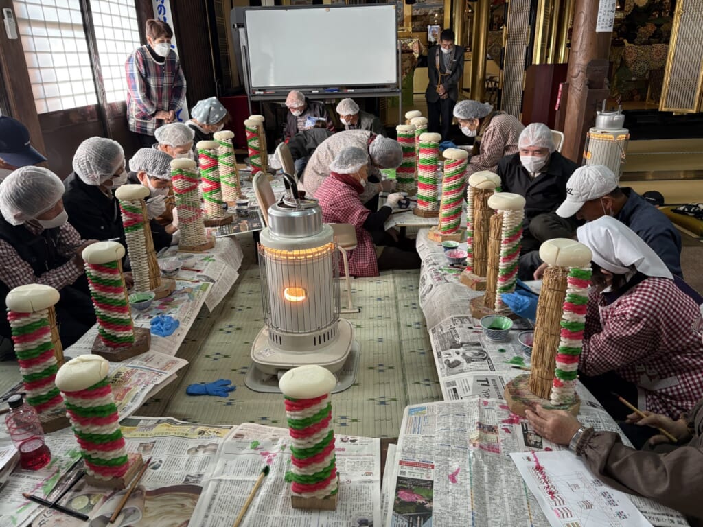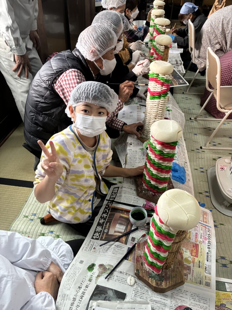 10日のお餅つき、型抜き、木の板に広げて同じ厚さにする作業