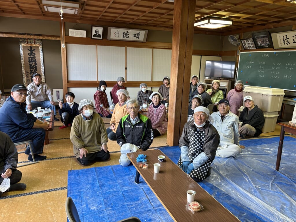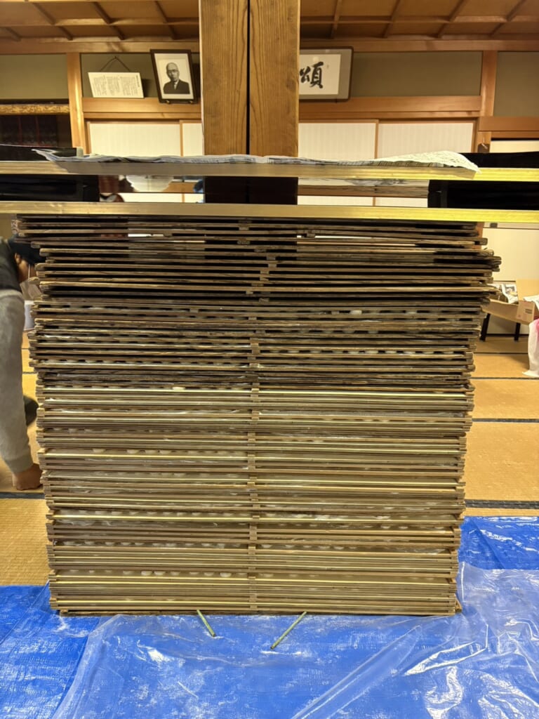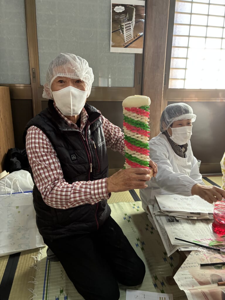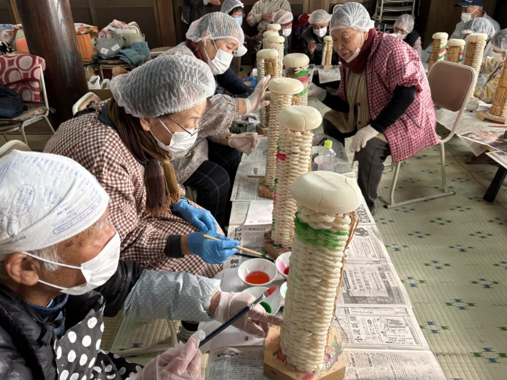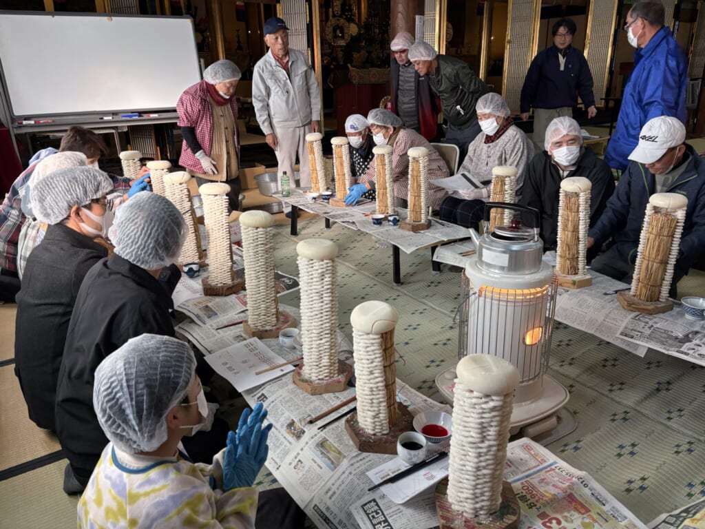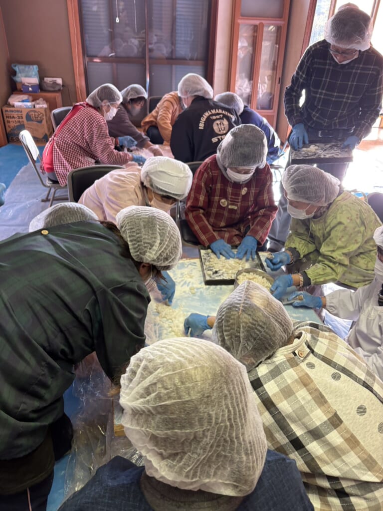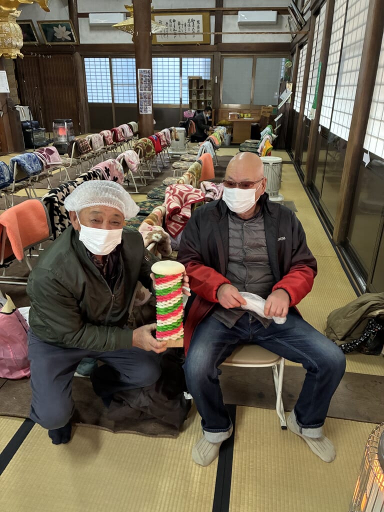 10日のお餅つき、型抜き、木の板に広げて同じ厚さにする作業