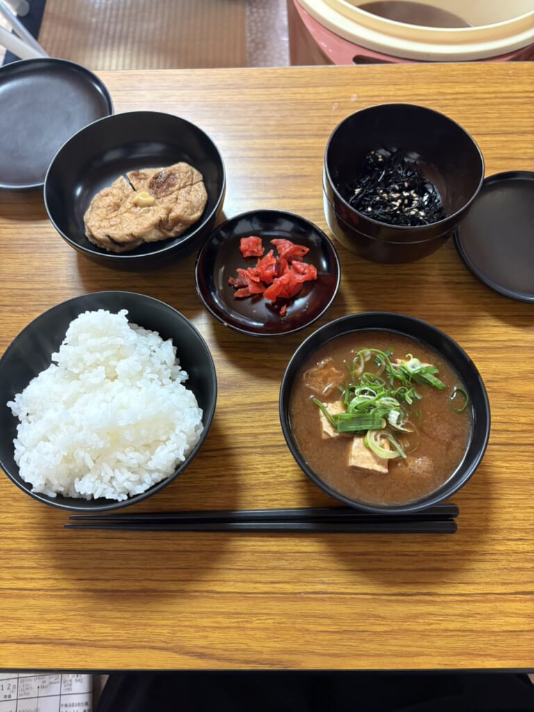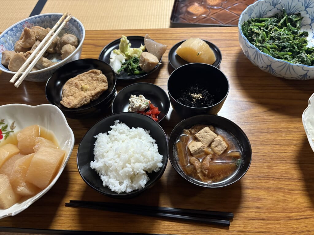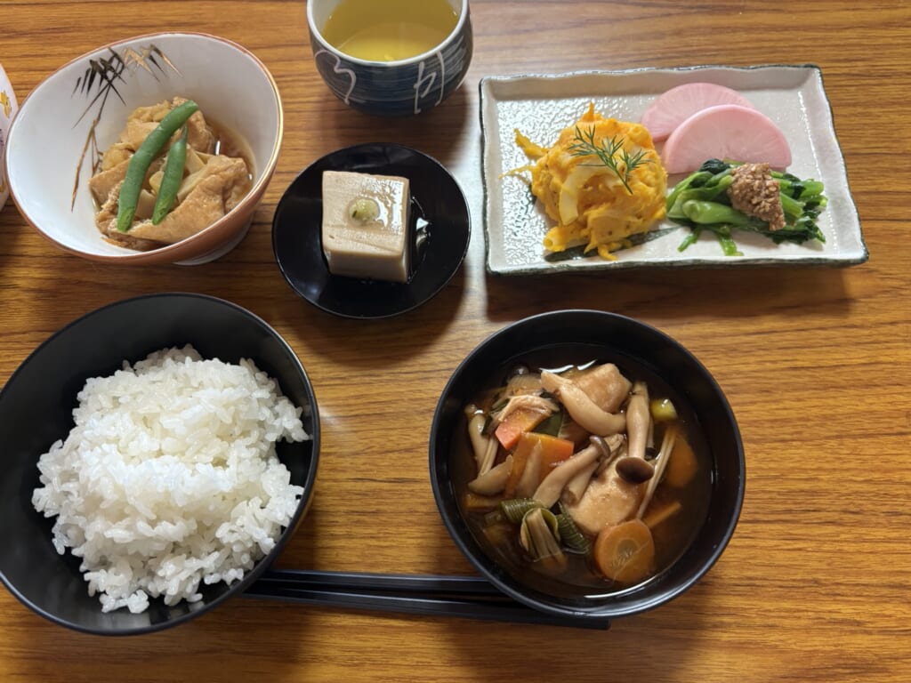 芋煮、ごま豆腐、お浸し、お漬物、かぼちゃのサラダ、うす揚げの筍じゃがいも包み煮